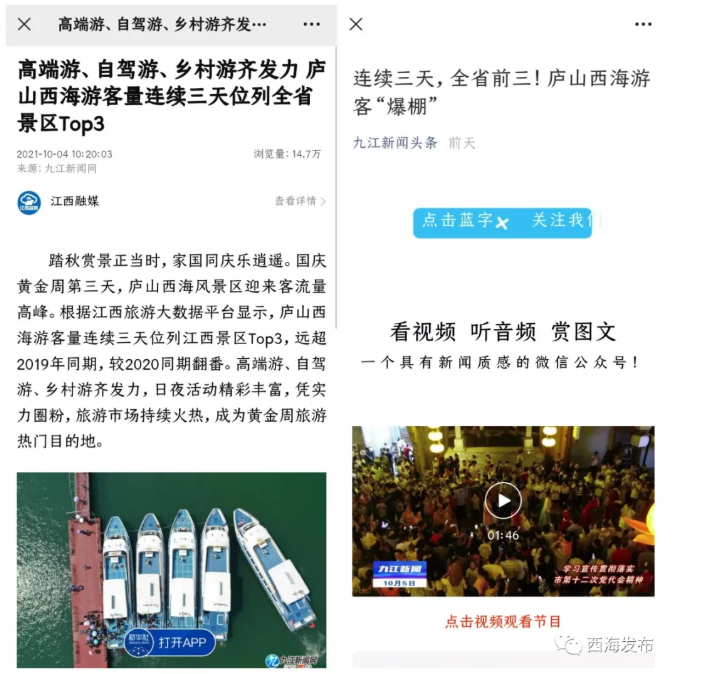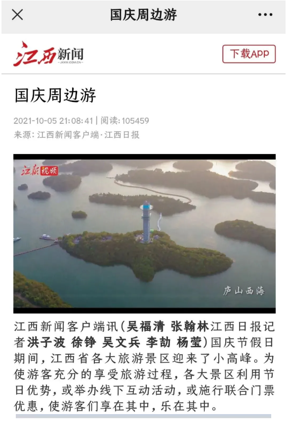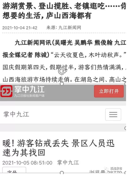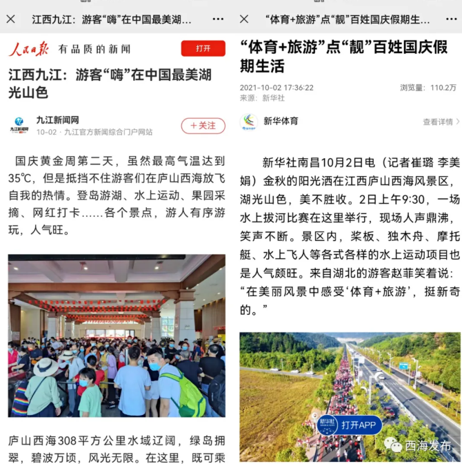 十一黄金周期间,庐山西海风景区组织新闻媒体大力宣传景区黄金周资讯,突出报道景区内广大游客欢度假日和旅游接待盛况,不断提高庐山西海风景区旅游知名度和吸引力。人民日报、新华社、学习强国报道庐山西海特色旅游亮点纷呈、庐山西海”体育+旅游”点“靓”百姓国庆假期;江西卫视新闻联播报道庐山西海景区旅游盛况,江西电视台报道庐山西海国庆假期非遗文化旅游创新高,江西日报、九江发布、九江新闻头条等报道庐山西海旅游火爆、游客量稳居全省景区Top3……